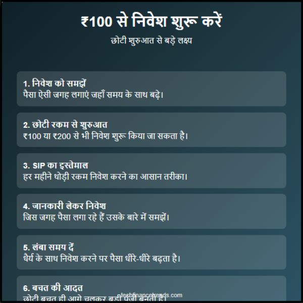 जैसा की आप सभी जानते है आजकल लगभग हर व्यक्ति चाहता है कि उसका पैसा सिर्फ खर्च ही न हो बल्कि समय के साथ बढ़े भी। लेकिन बहुत से लोगों को लगता है कि निवेश शुरू करने के लिए हजारों या लाखों रुपये चाहिए। सच यह है कि अगर सही तरीका अपनाया जाए तो ₹100 से भी निवेश की शुरुआत की जा सकती है।