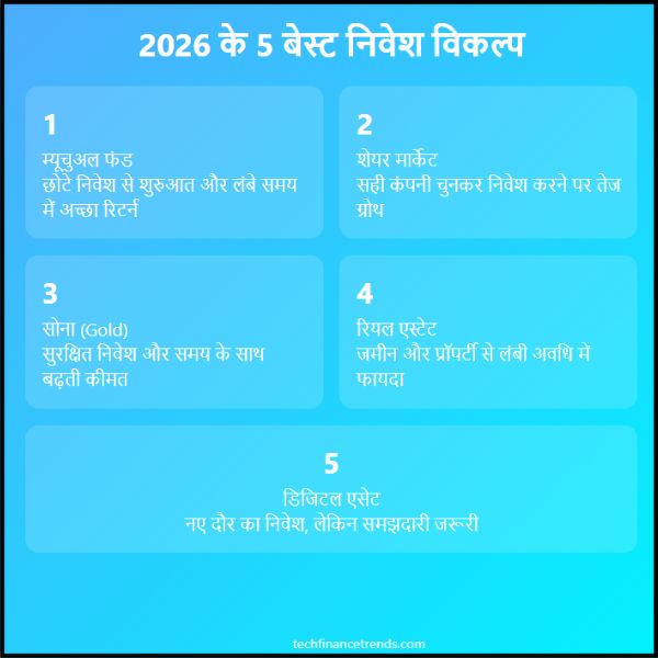 नमस्कार दोस्तों आज मैं आपको 2026 के 5 बेस्ट निवेश विकल्प : पैसा तेजी से बढ़ाने के तरीके बताने वाला हु तो हमारे आर्टिकल को अंत तक अच्छी तरीके से पढिए ओर जानिए ,आज के समय में सिर्फ पैसा कमाना ही काफी नहीं होता, उसे सही जगह लगाना भी उतना ही जरूरी होता है। कई लोग मेहनत करके पैसा तो कमा लेते हैं, लेकिन सही निवेश न करने की वजह से वह पैसा बढ़ नहीं पाता। अगर थोड़ी समझदारी से निवेश किया जाए तो वही पैसा समय के साथ अच्छा रिटर्न दे सकता है।
