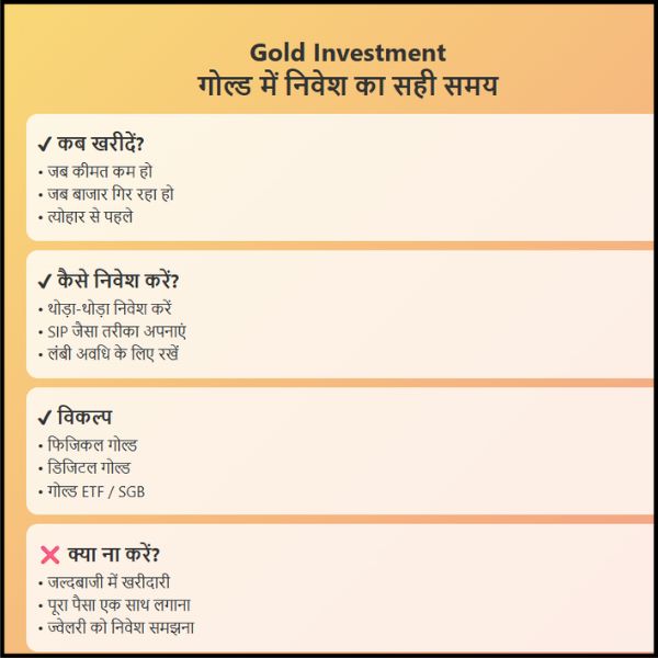 लेकिन सबसे बड़ा सवाल यही होता है कि गोल्ड में निवेश करने का सही समय क्या है? क्या जब कीमत कम हो तब खरीदना चाहिए, या जब बाजार नीचे जा रहा हो तब? आइए इस बात को बहुत ही आसान भाषा में समझते हैं।