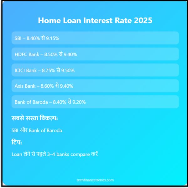 - 2025 में होम लोन की ब्याज दर लगभग 8% से 10% के बीच है