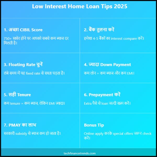 नमस्कार दोस्तों आज मैं आपको बताऊँगा की “Low Interest Home Loan Kaise Mile: 2025 के 7 Best Tips “तो अंत तक आर्टिकल को पढिए ओर जानिए,आज के समय में अपना घर लेना हर किसी का सपना होता है, लेकिन इस सपने को पूरा करने के लिए ज्यादातर लोगों को होम लोन लेना पड़ता है। अब यहाँ सबसे बड़ा सवाल यह होता है कि कम ब्याज दर (Low Interest Rate) पर लोन कैसे मिले, क्योंकि यही एक चीज तय करती है कि आपको बैंक को कुल कितना पैसा वापस करना पड़ेगा।